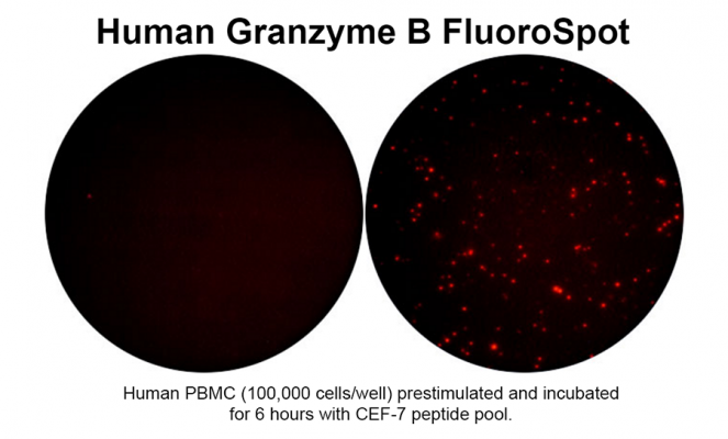 This ImmunoSpot® Detection kit contains detection antibodies and fluorochrome conjugates that bind to the secreted cytokine of interest. The fluorochrome conjugates contain proprietary dye systems for fluorescence detection of the specific cytokine by scanning and analyzing the emitted wavelength of the fluorochrome(s) using an ImmunoSpot® fluorescent Analyzer.