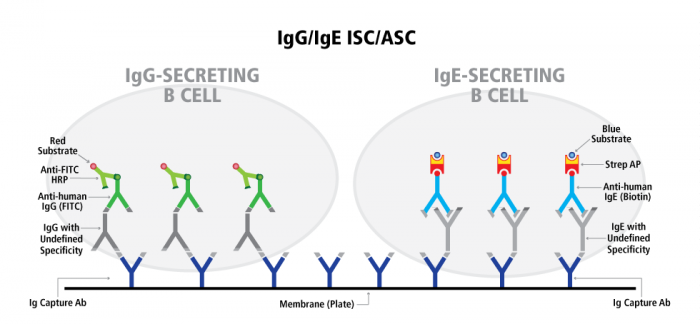 This ImmunoSpot® kit contains PVDF-membrane plates, diluents, capture antibody, detection reagents, colorimetric substrates and a polyclonal B cell stimulator (Human B-Poly-SE™) capable of eliciting IgE+ antibody-secreting cells (ASC).