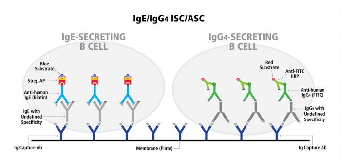 This ImmunoSpot® kit contains PVDF-membrane plates, diluents, capture antibody, detection reagents, colorimetric substrates and a polyclonal B cell stimulator (Human B-Poly-SE™) capable of eliciting IgE+ antibody-secreting cells (ASC).