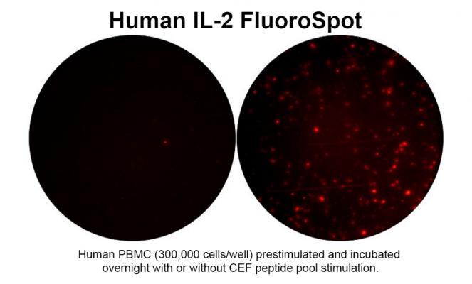 This ImmunoSpot® Detection kit contains detection antibodies and fluorochrome conjugates that bind to the secreted cytokine of interest. The fluorochrome conjugates contain proprietary dye systems for fluorescence detection of the specific cytokine by scanning and analyzing the emitted wavelength of the fluorochrome(s) using an ImmunoSpot® fluorescent Analyzer.