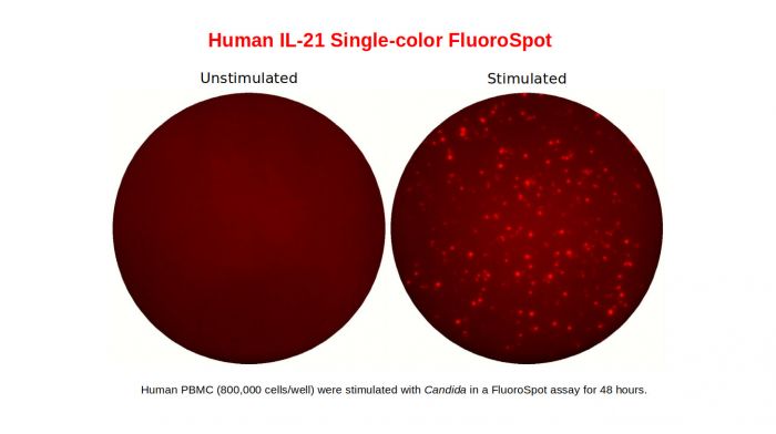 This ImmunoSpot® Detection kit contains detection antibodies and fluorochrome conjugates that bind to the secreted cytokine of interest. The fluorochrome conjugates contain proprietary dye systems for fluorescence detection of the specific cytokine by scanning and analyzing the emitted wavelength of the fluorochrome(s) using an ImmunoSpot® fluorescent Analyzer.