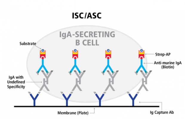 This ImmunoSpot® kit contains PVDF-membrane plates, diluents, capture antibody, detection reagents, colorimetric substrates and a polyclonal B cell stimulator (Mouse B-Poly-S™) that promotes differentiation of B cells into antibody-secreting cells (ASC) capable of producing IgA, IgG or IgM.