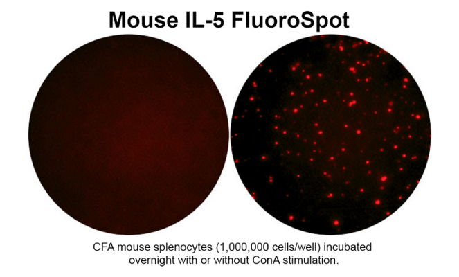 This ImmunoSpot® Detection kit contains detection antibodies and fluorochrome conjugates that bind to the secreted cytokine of interest. The fluorochrome conjugates contain proprietary dye systems for fluorescence detection of the specific cytokine by scanning and analyzing the emitted wavelength of the fluorochrome(s) using an ImmunoSpot® fluorescent Analyzer.
